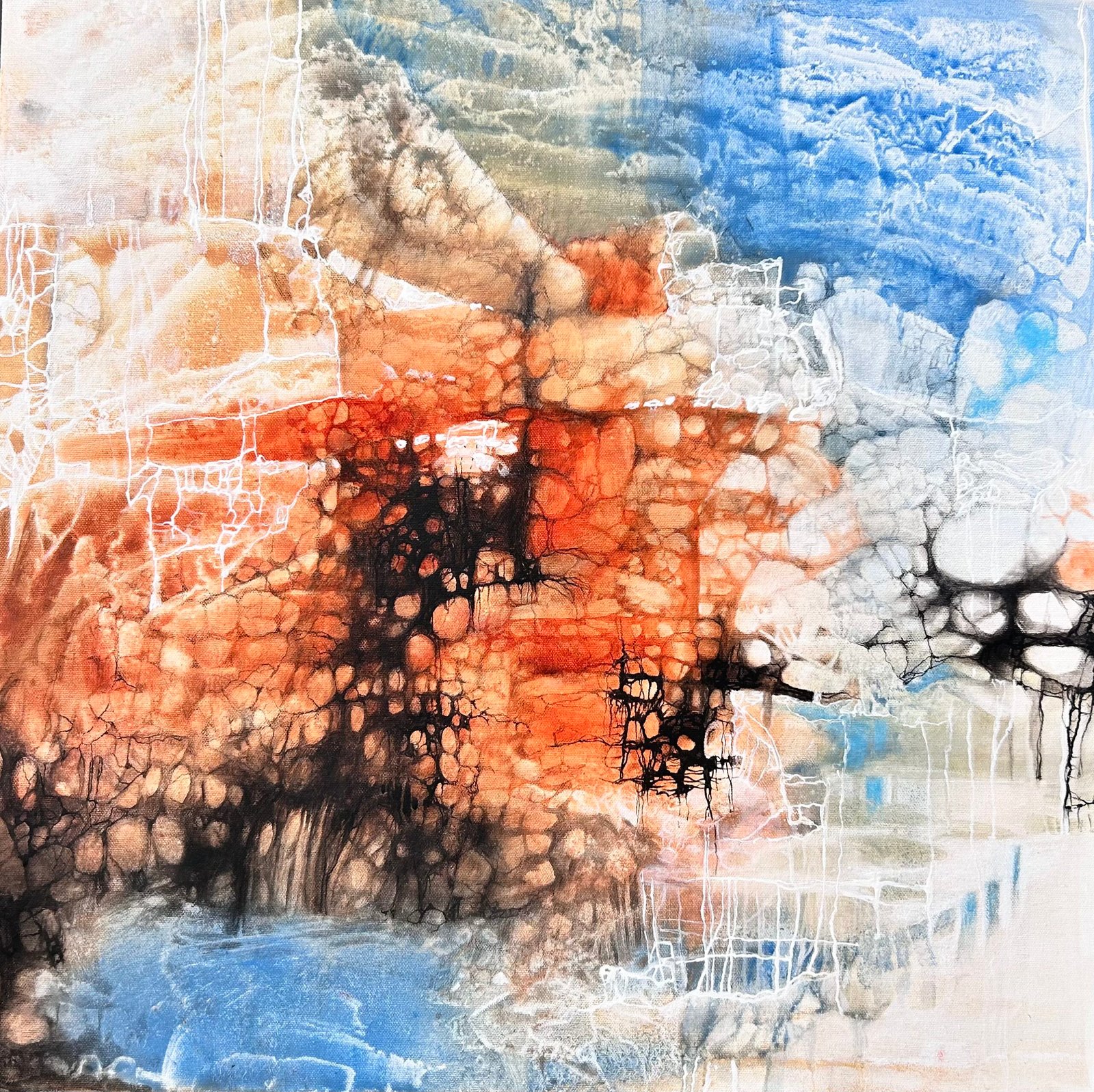 The composition reflects an abstract meeting point—where textures, colours, and forms interact in a subtle yet powerful way. Soft transitions contrast with richer areas of depth, allowing the painting to feel both grounded and fluid at the same time.